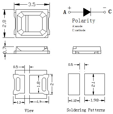 Dimension(Tolerance:+/-0.1mm. Unit:mm) (Mark is cathode)